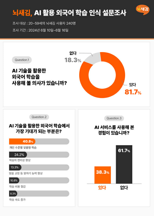 뇌새김 설문조사…응답자 81.7%, AI 활용한 외국어 학습 사용 의사 밝혀
