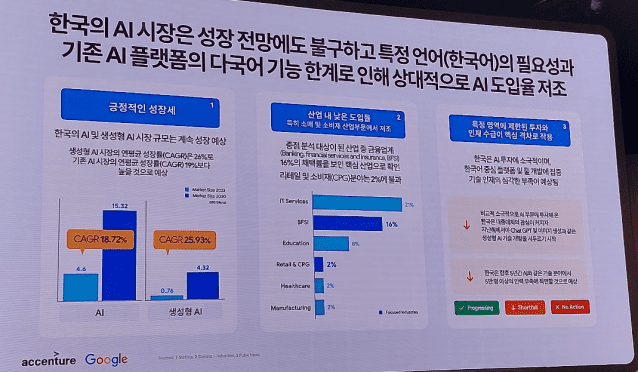 그러면서도 "AI가 한국에서 실무에 적용되는 비중은 생각보다 낮다"면서 그 이유로 한국어라는 장벽, AI 관련 인력 부족, 산업 지원 역량과 인프라 부족 등을 언급했다.