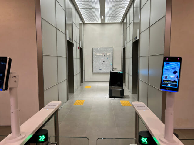 아직 문을 연지 얼마 안 된 새 건물이지만 로봇을 활용해 커피 주문을 이용하는 모습을 어렵지 않게 볼 수 있었다. 로봇은 커피숍 주문대에서 음료를 받아 오피스 공간으로 향하는 보안 게이트를 열고 엘리베이터를 타러 갔다. 게이트는 얼굴 인식을 거쳐야만 통과할 수 있지만 얼굴 없는 로봇은 무선 통신으로 지나갈 수 있었다.