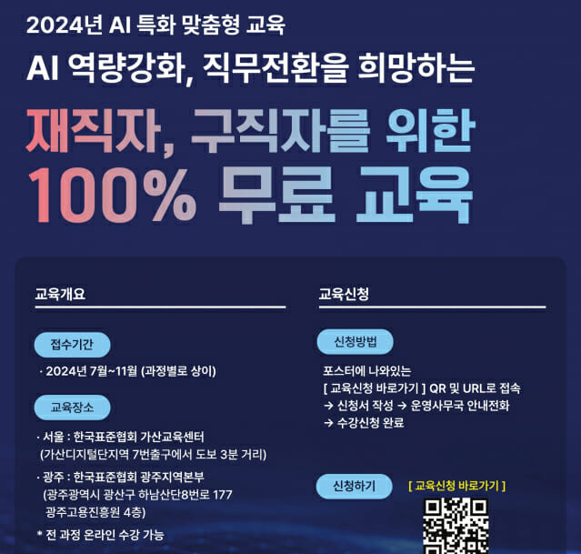 한국표준협회(회장 강명수)는 인공지능(AI) 역량강화와 직무전환을 희망하는 재직자와 구직자를 위한 AI 특화 맞춤형 교육을 서울과 광주에서 진행한다고 3일 밝혔다.