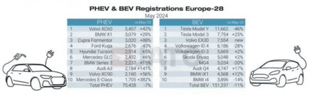 5월 유럽 등록 플러그인하이브리드(PHEV)도 '볼보 XC60', 'BMW X1', '쿠프라 포멘토' 등이 상위를 차지했다. 볼보 XC 60, BMW X1도 중국에서 생산되는 모델이다.