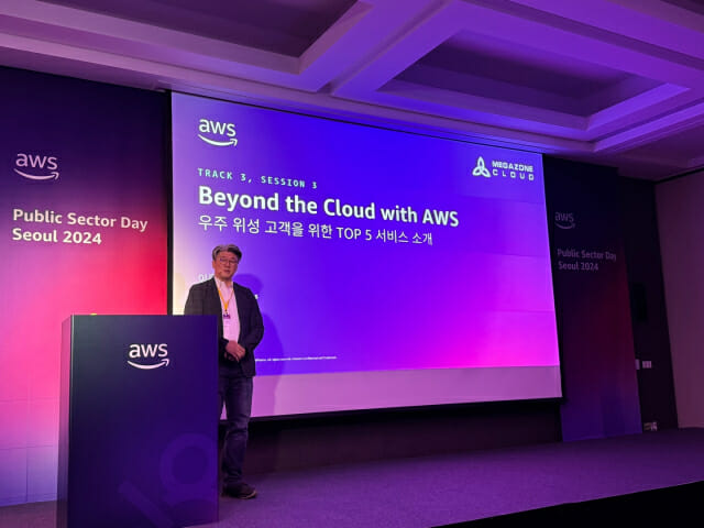메가존클라우드 이용진 글로벌 세일즈 팀장은 4일 AWS 퍼블릭 섹터 데이 서울 2024 의 '우주위성 고객을 위한 TOP 5 서비스 소개' 세션에 참석해 우주산업 관련 고객들이 AWS와 메가존클라우드를 통해 어떤 도움을 받을 수 있는지 연설했다.