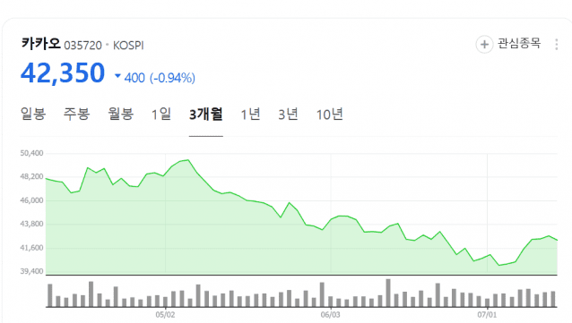 카카오는 이날 전날 종가보다 0.94% 떨어진 주당 4만2천350원으로 장을 마감했다. 지난 5월 주가가 4만5천원 이하로 하락한 뒤 아직 4만5천원 선을 회복하지 못했다.