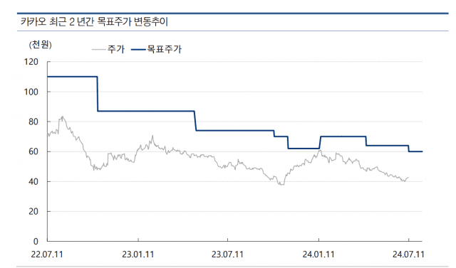 증권가에서도 카카오의 부진한 실적과 신성장 전략 부재를 지적하며 목표가를 하향했다. 한국투자증권은 5만원으로 가장 낮은 목표주가를 제시했고, 하이투자증권도 목표주가 기존 7만5천원에서 6만2천원으로 20% 하향하는 등 대부분의 증권사가 5만~7만원 범위로 목표주가를 낮췄다.