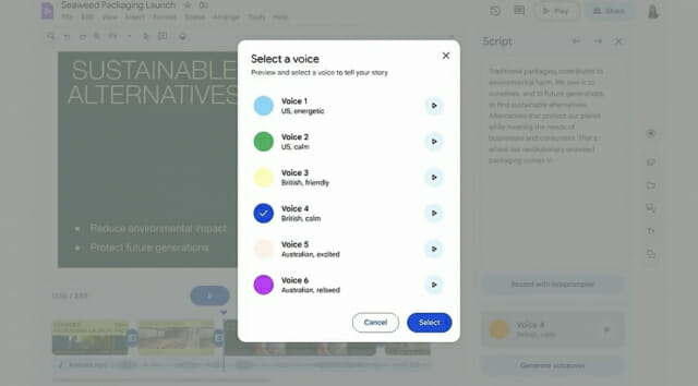 사용자가 PPT에 추가하고 싶은 영상이나 사진을 프롬프트로 입력하면, 구글 비즈가 몇 분 내 생성해 슬라이드에 넣어 준다. 영상에 등장하는 목소리 톤도 자유자재로 바꿀 수 있다.