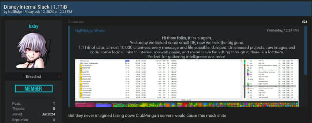 15일 해크리드 등 외신에 따르면 해킹조직 널벌지(NullBulge)는 디즈니의 시스템에 침투해 약 1.2TB(테라바이트) 규모의 데이터를 탈취했다는 내용의 게시물을 사이버범죄 및 해커 플랫폼 브리치 포럼에 올렸다.