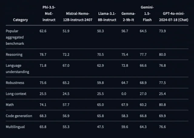 이를 통해 파이3.5 MoE는 일부 작업의 벤치마크 결과에서 GPT-4o 미니를 넘어서는 결과를 달성했다.